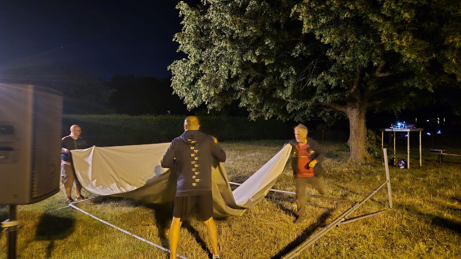 Das Wetter ließ uns allerdings diesmal etwas "zittern", doch die Regenschauer schrammten zum Glück knapp an uns vorbei. Nur ein kleines Stürmchen ließ unsere Leinwand und meinen Schirm für die Technik für ein paar Minuten ganz schön zappeln. Aber es blieb bis zum Schluss trocken.
